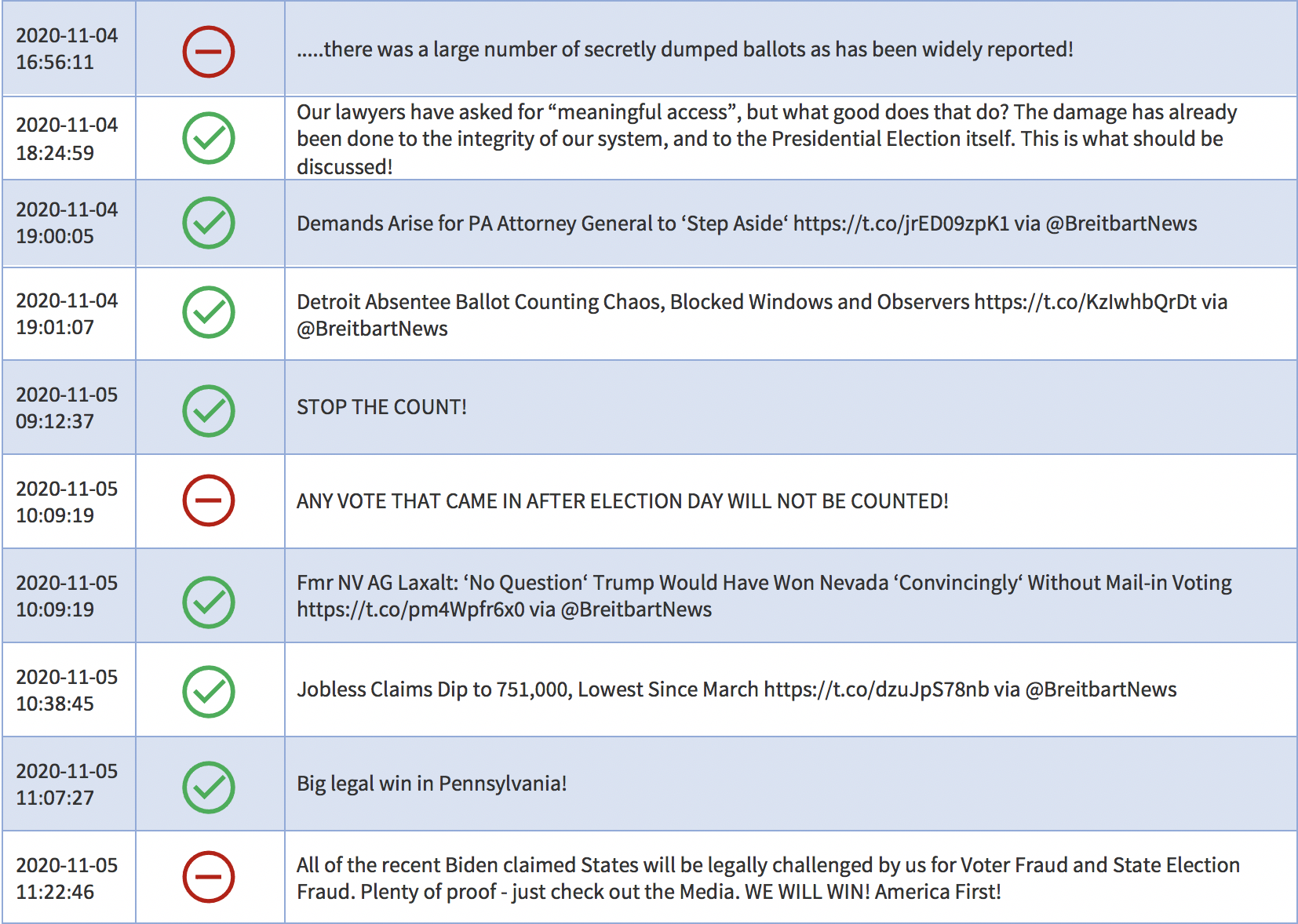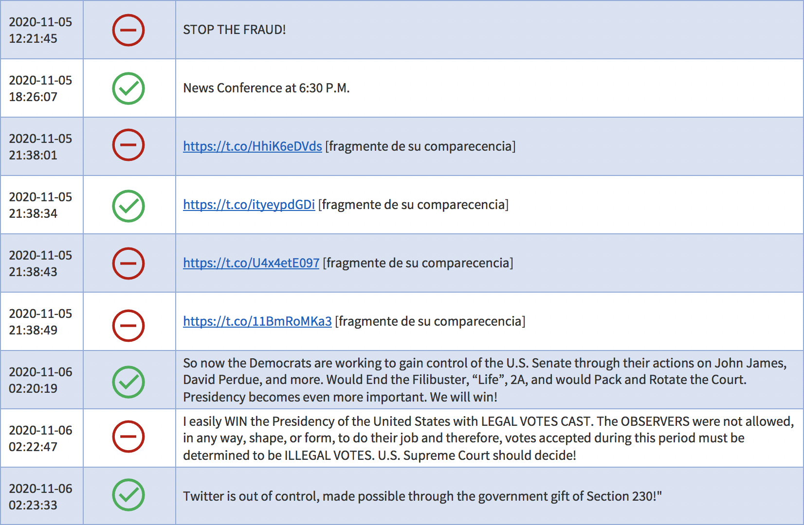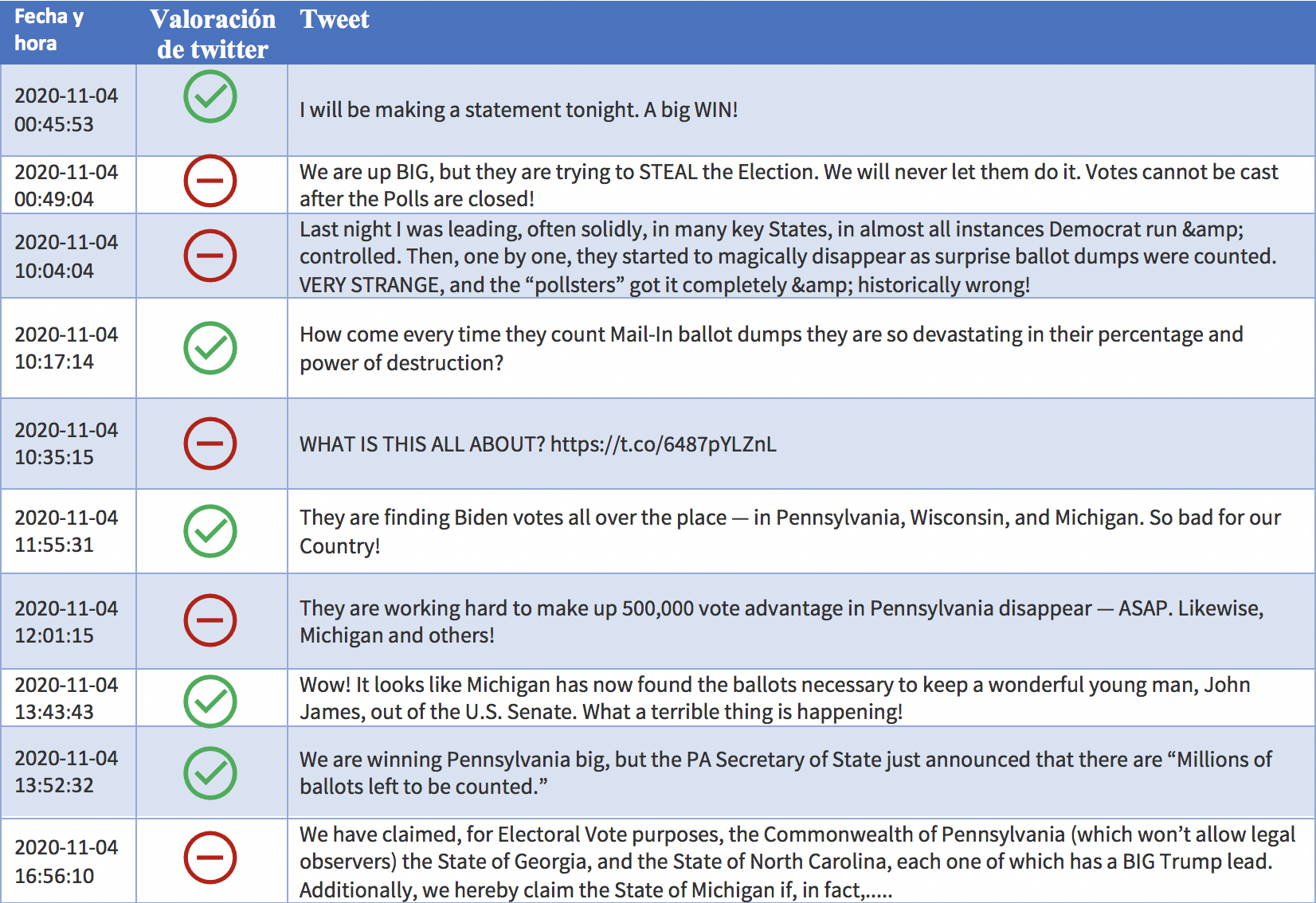 En la tabla siguiente pueden verse los tweets publicados por Trump entre el 4 y el 6 noviembre y la valoración que hizo Twiter de ellos. En ese intervalo de tiempo el todavía presidente de EEUU publicó 29 tweets -excluyendo retweets-, una secuencia probablemente histórica que comienza con el anuncio de una gran victoria y termina con Trump clamando que Twitter está fuera de control. De esos 29 tweets, trece han sido marcados por Twitter como contenido engañoso, uno de ellos es visible totalmente a pesar del mensaje de aviso, pero los 12 restantes están ocultos bajo una advertencia que reza: «Alguna parte o todo el contenido compartido en este tweet ha sido objetado y puede ser engañoso respecto de cómo participar en una elección u otro proceso cívico”. Si se pulsa a la derecha del aviso de puede ver el contenido del tweet, no obstante, éste no puede ser retweeteado, por lo que no puede ser compartido por los usuarios de la red social. Los tweets marcados por la red social son aquellos en los que Trump hacia referencia a la existencia de fraude electoral o de alguna irregularidad en la votación, lo que incluye tres tweets en los que el mandatario compartía videos con fragmentos de su comparecencia del día 5 de noviembre. Algo similar aconteció en Facebook.
